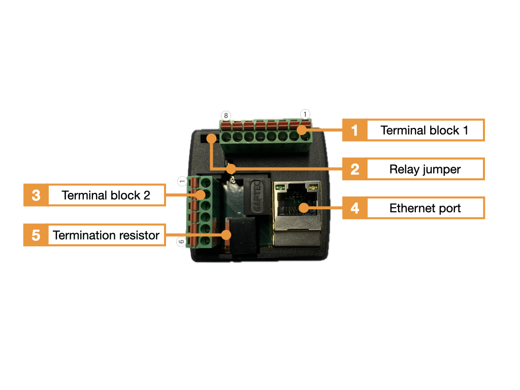 - Terminal block 1 (terminal 1-8, IO terminal with relay 1+2, digital input 1+2)