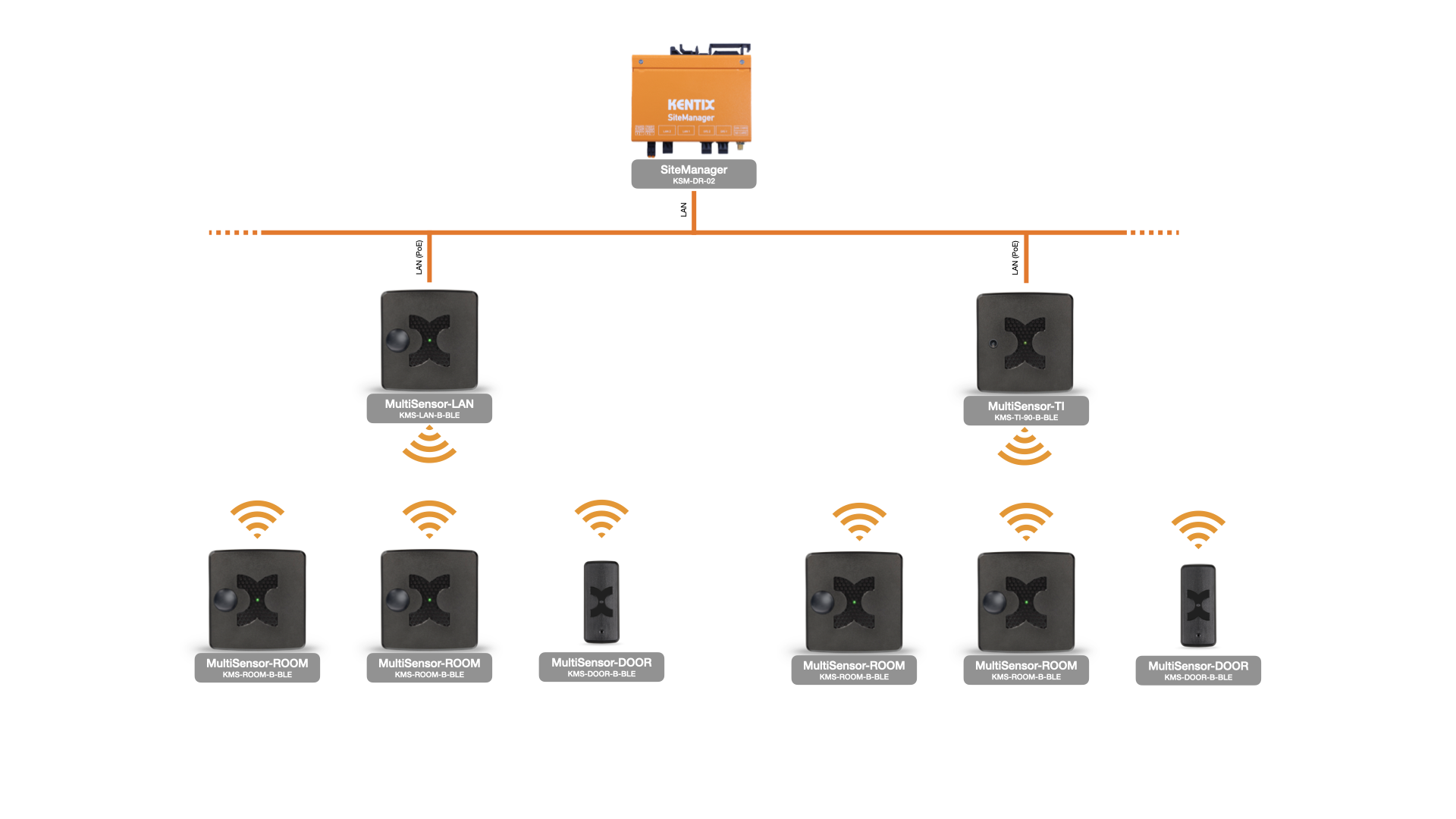 A SiteManager or AlarmManager in the MAIN-DEVICE operating mode is required for central management. Teach-in and configuration are performed entirely via the KentixONE web interface. The wireless range between the gateway (MultiSensor-LAN-BLE or MultiSensor-TI-BLE) and MultiSensor-ROOM-BLE can be up to 20m. Up to 25 wireless sensors can be taught-in to a wireless Ethernet gateway.